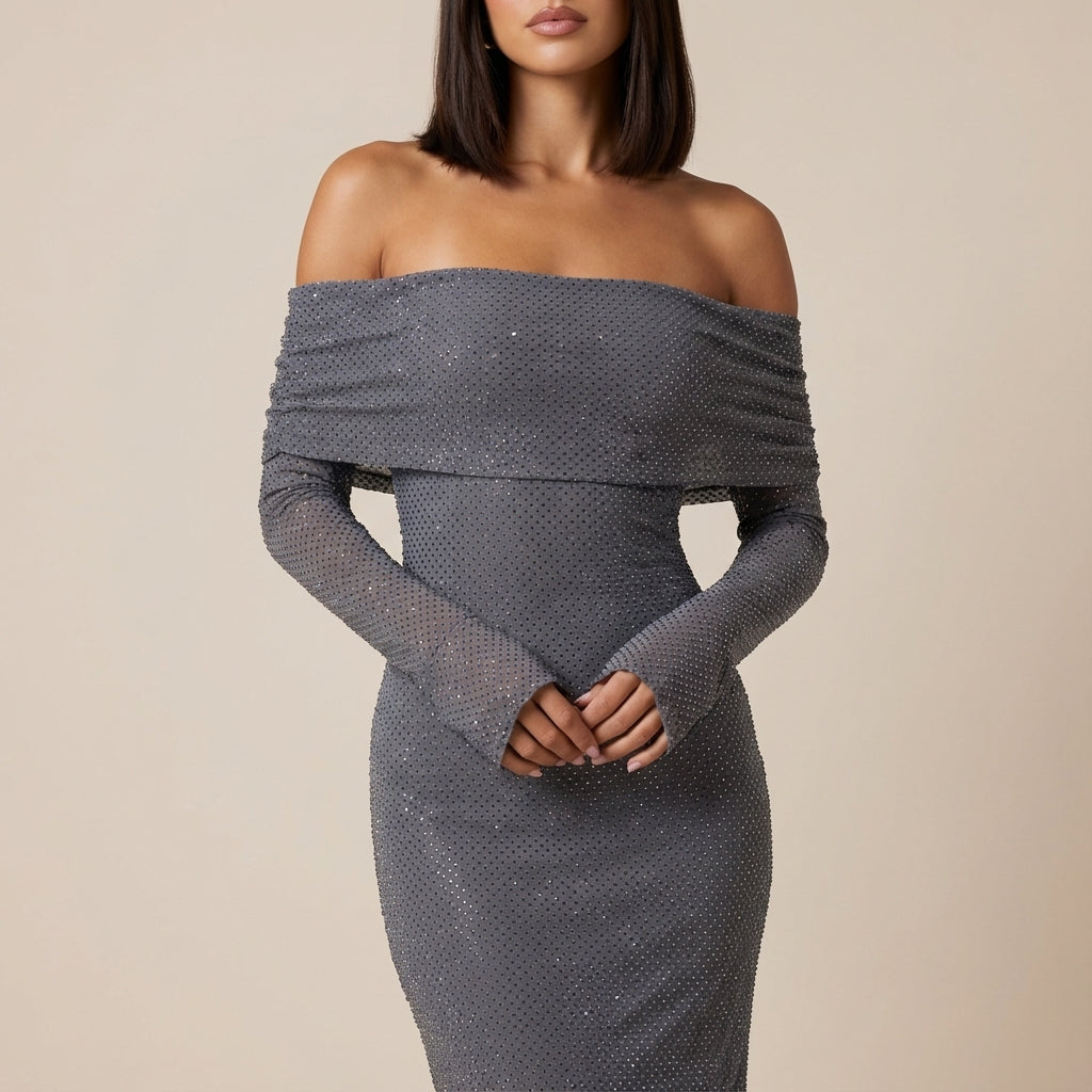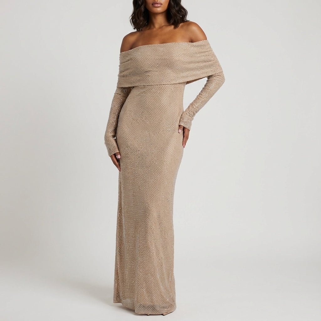 Vestido maxi para mujer diseñado para eventos nocturnos y reuniones formales. Presenta diseño sin hombros, mangas largas y corte ajustado. Incluye un acabado con decoración brillante distribuida en la superficie del tejido.